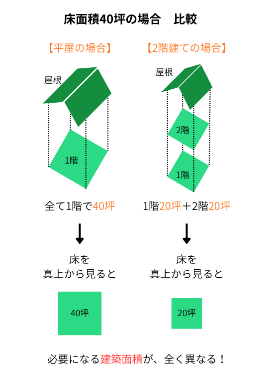 まずは延床面積40坪の家を建設する場合に、必要となる土地の広さ=建築面積について。
