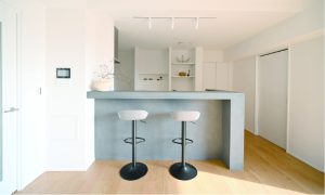 こだわりのキッチン周り&家事ラク導線。キッチンは特殊塗装のモールテックスを採用。背面収納は、小物から家電までしっかり収納!