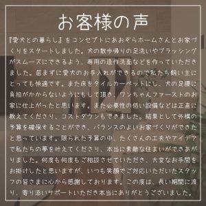 愛犬と暮らす世界に一つのこだわりのお家です。デザインと性能を兼ね備えた『あおぞらホーム』の家をぜひ見に来てください!