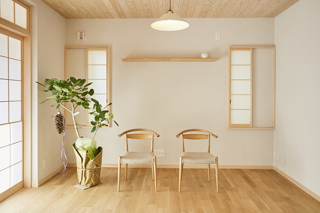 障子や木の建具が調和する、明るく落ち着いた雰囲気のリビング。