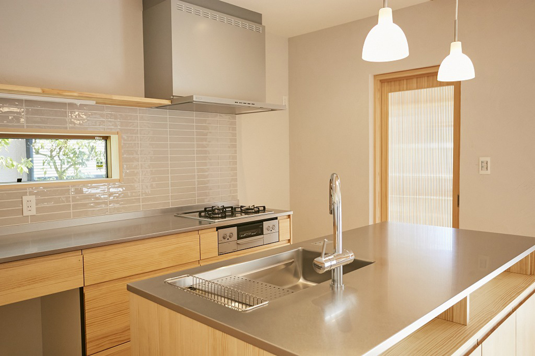 木、ステンレス、タイル、シラス壁の異素材の調和が美しいキッチン空間。
