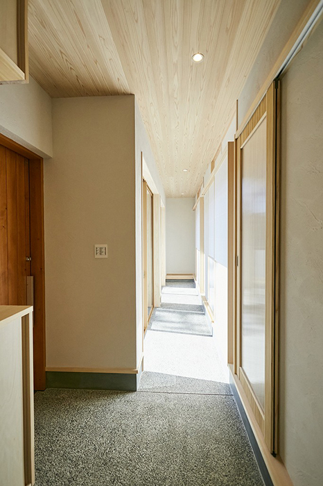 洗い出し仕上げの広い土間と木の格子が出迎える玄関。