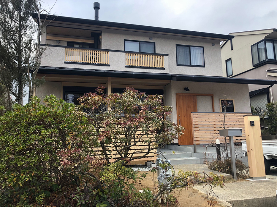 そとん壁の柔らかな風合いと木の格子が調和する落ち着いた外観。