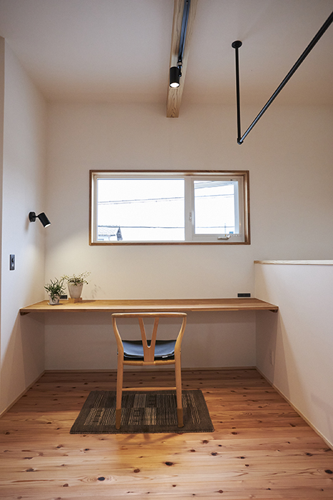 障子越しの光が差し込む明るい書斎。造作のカウンターと棚を備え、リモートワークにも対応する。4.5帖のゆとりある空間。