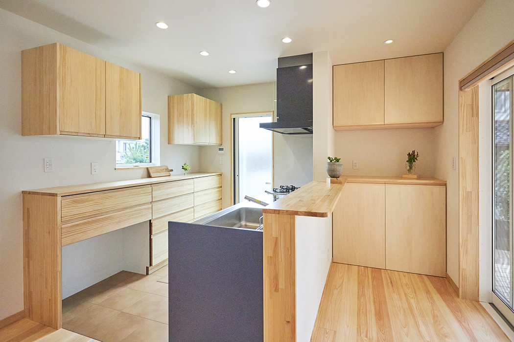 無垢のカウンターと木目の美しい収納が並ぶ、明るく温もりあるキッチン。