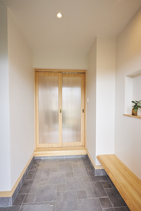木製引き戸とタイル張り土間、木製ベンチが調和する玄関スペース。