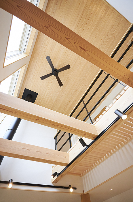 杉の白太の天井と梁、キャットウォーク、オーダーの黒いアイアン手すりが映える、開放感あふれる吹き抜け。