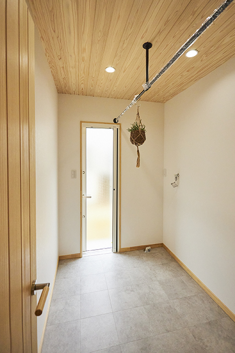 ソトと繋がるゆとりのランドリースペース。インテリア性のある室内干しバーを備えて。
