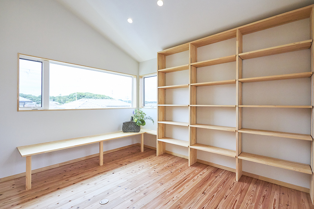 窓の配置計画で眺望を楽しめるセカンドリビング。造作のベンチと棚が使いやすく自由度を広げる。