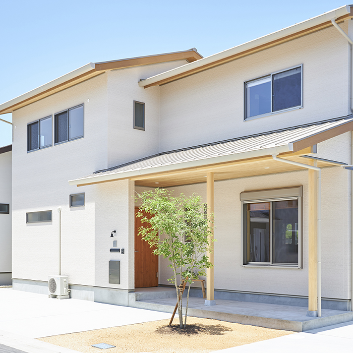 板張りの軒付き玄関ポーチが心地よく、雨の日も快適。自転車置き場としても活用できる。