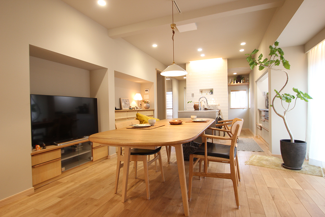 築60年の古民家の一階部分をリノベーションし、日本家屋の魅力を残しながら、現代の快適な暮らしを実現した同邸宅。もともとは断熱性の低さ、耐震面への不安、屋外設置の水回りなど、日常生活に多くの不便を抱えていた。今回の改修では、スケルトンリフォームによって構造を見直し、断熱材や耐震壁を取り入れて性能を大幅に向上させた。水回りは建物内に取り込み、家事動線も改善。使い勝手のよいオーダーキッチンや、広々としたウォークインクローゼットなど、生活の質を高める工夫も随所に施されている。