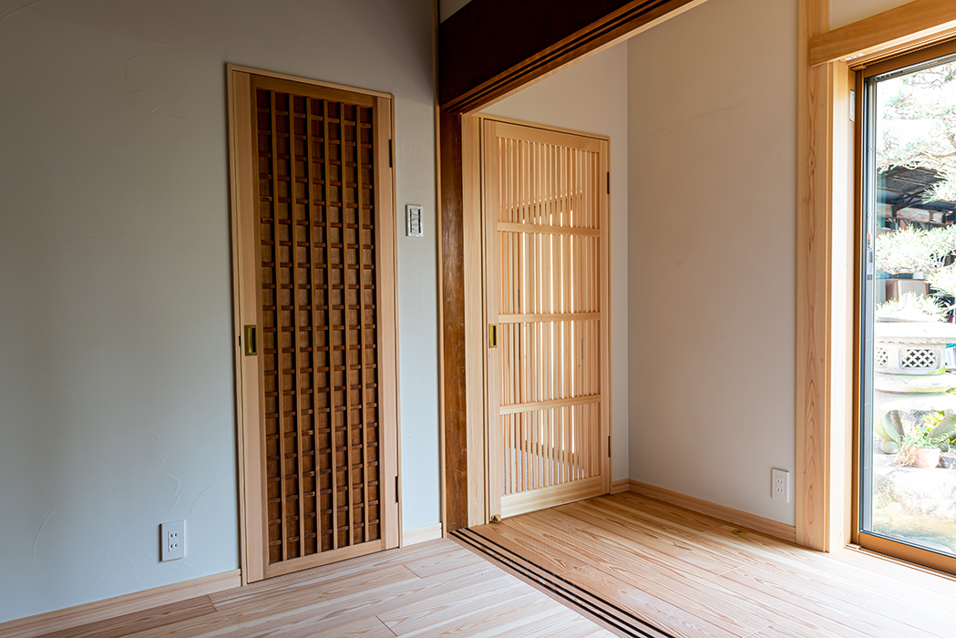 趣を残してリメイクされたセンス溢れる建具がしっくりと旧家リフォームに馴染む。