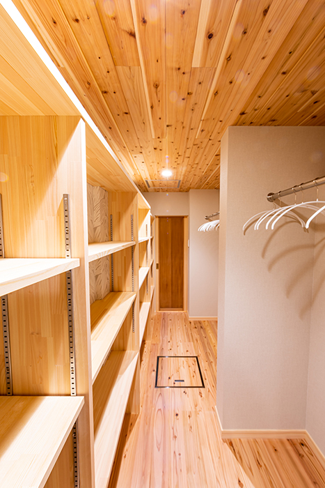 家の中の洋と和を分けるように設けられた奥に長いウォークインクローゼットの収納力ですっきりと暮らせる。
