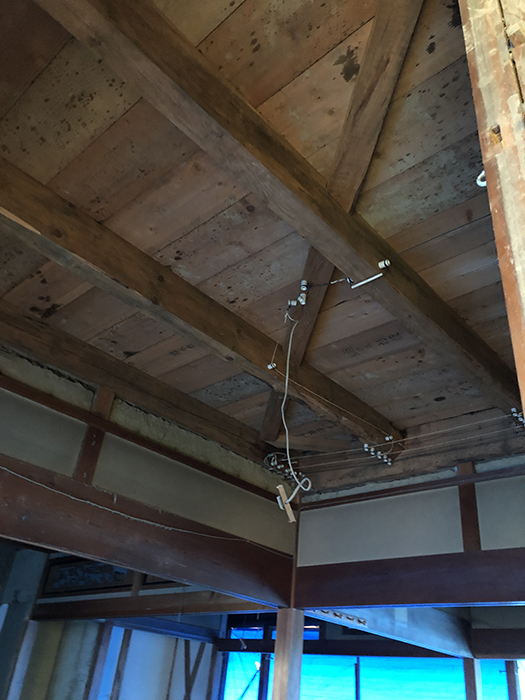 スケルトンリフォームで判明した天井に斜めに入っていた部材。60年前の家の堅牢な構造に驚かされる。