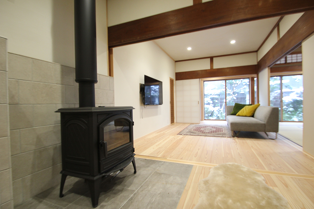 また、内装デザインには和洋折衷の要素を取り入れ、松の梁や古い建具を活かしつつ、オークの床材やイギリスの塗料など、素材選びにもこだわった。薪ストーブの導入により、家族や親戚が集まる場としての機能も強化。縁側と庭の景観を室内に取り込む設計により、自然との一体感を感じられる空間が生まれた。