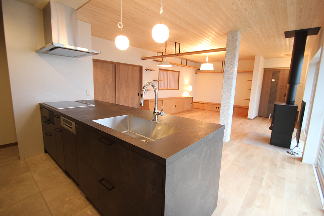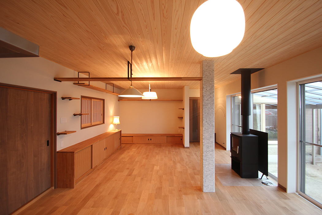 昔ながらの日本家屋が、家族の今の暮らしに寄り添う住まいへと生まれ変わった。南向きの縁側を取り込み、薪ストーブのある明るいLDKが日常の中心になった。かつて結婚式も行われた和室や仏間はそのまま残し、家族の思い出に手を添える形で空間を再構成。対面キッチンや断熱性能の向上により、冬も快適な温もりが保たれる。ご家族は「木目を見ると幸せになります」と話し、天井を見上げる時間を大切にしている。猫のために設けたキャットウォーク、母親との同居に合わせた間取りの工夫など、細部まで暮らしに寄り添ったつくりが随所にある。過去をただ保存するのではなく、今の家族が心地よく過ごせるよう調和させたこの住まいには、年月を超えた温かさが息づいている。