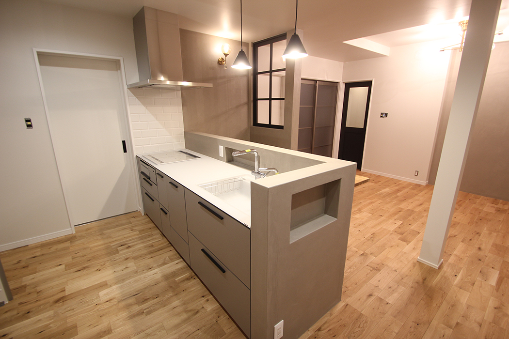 TOTOのシステムキッチンにモールテックスを施し、無垢オークの床が引き立つスタイリッシュで木の温かみを感じる空間に。