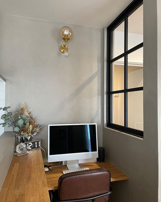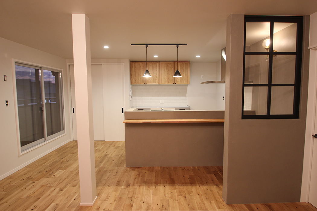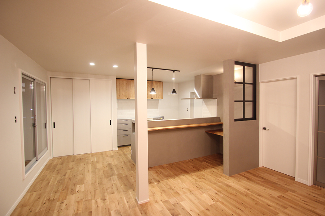 ご実家の2階部分をフルリノベーションした住まい。玄関を2つに分け、1階は親世帯、2階は子供世帯が暮らす二世帯仕様で、各世帯がそれぞれ独立して暮らせる設計となっている。2階は暮らしやすい回遊動線を取り入れつつ、新たに水廻りを設置するなど間取りを大きく変更。窓を中心に外壁も断熱を強化し性能を向上させた。床は無垢オーク材、キッチンは既製品にモールテックス塗装を施し、ワークスペースに無垢材のカウンターを施工した。内装は、色選定にもこだわり、洗練されたシックな空間に深い色の建具が良いアクセントになっている。使用されていなかった2階がリノベーションにより子供世帯の住まいに生まれ変わった好例だ。