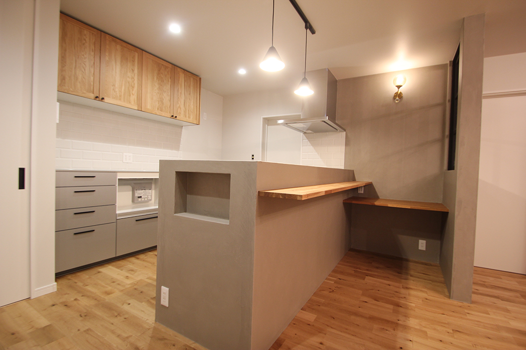 TOTOのシステムキッチンにモールテックスを施し、無垢オークの床が引き立つスタイリッシュで木の温かみを感じる空間に。
