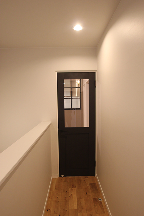 無垢オーク床の廊下に設置した深い色合いのガラス扉。光を通し空間に広がりを持たせる。