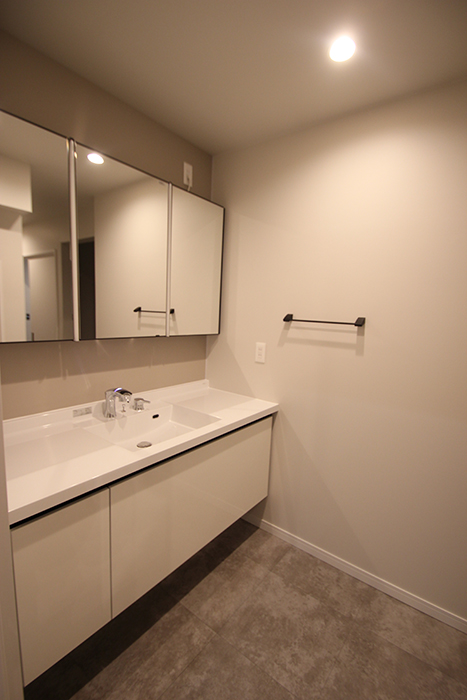 白とグレーでまとめた、ゆとりのある洗面室。お好みのシンプルで洗練されたテイストに。