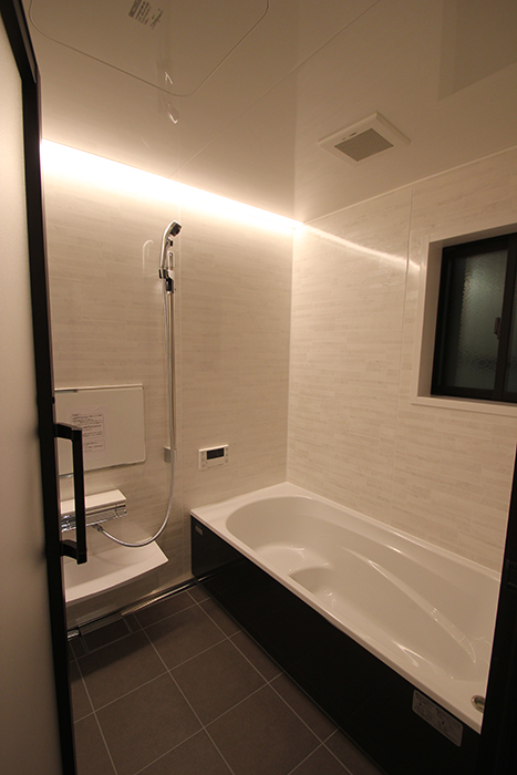 間接照明が落ち着く浴室。黒と白でシンプルにまとめ、清潔感と高級感を両立している。