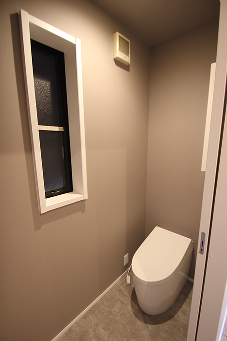 グレージュのクロスとグレーの床が上品に調和し、落ち着いた空間を演出している、心地よい雰囲気のトイレ。