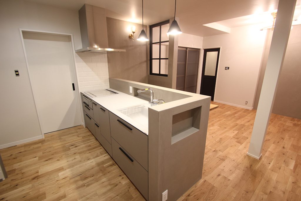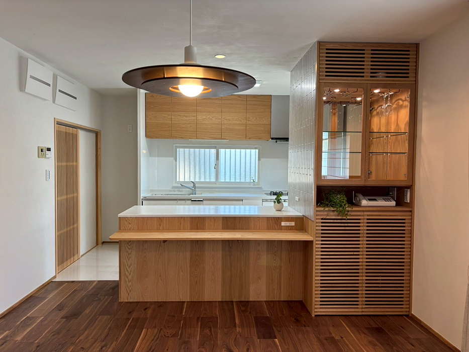 同邸宅のリフォームは、上質な空間リフォームの好例と言える。キッチン空間のご希望を叶え、住環境を整えた。特に今回のリフォームの要となったキッチンは、「既製I型キッチン」と「建築家具職人と連携し製作した造作収納家具」でご要望をカタチにした。また断熱工事、内窓設置、床暖房の導入で快適に過ごせる住環境を整えた。空間全体は、開放的なワンルームに間取り変更しながらも、「造作収納家具」や「一段下げた板張り天井」で空間分けをして居心地と使い勝手のバランスを取っている。お好みのインテリアスタイルに合わせ、床は深い色合いが美しいウォールナットを選択。無垢杉格子建具、格子飾り窓、板張り天井に赤身の杉、大理石キッチンタイルを採用するなど、素材やしつらえにもこだわった。漆喰塗壁は柔らかい雰囲気をつくり、天井埋め込みボックスなど窓まわりのインテリアにもこだわり、洗練された高級感のある空間をつくった。