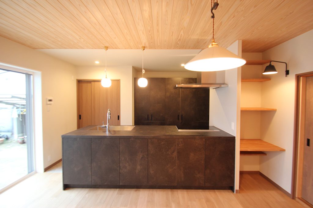 新居には、〝家族がのんびり暮らせる環境〟を求めていたというお施主様ご夫婦。見つけた築78年の物件は、「町家や平屋建てにも興味があった」というお施主様にとって、佇まいも周辺環境もぴったりだった。ただ、建物は古いため、自分たちの判断だけで購入を決めるのには不安を感じたそう。そこで、「以前にも物件見学でお世話になって、社長の古民家に対する専門的な知識やアドバイスが頼りになった」と、『島田工務店』に相談。結果、自分たちが希望する暮らし方がかなうと分かり、同社と一緒に行う古民家再生を決めたという。お施主様の住まいづくりのテーマは、「外からの見た目は変えず、でも中身は最新に」。そこで同社は、基礎の再工事や柱の追加などで住宅としての安全性を高め、その一方で間取りや設備の変更により暮らしやすさも向上。使える構造材や古建具は生かし、〝古民家らしさ〟をしっかりと残す改修を行った。縁側や廊下を取り込んだLDKは、天井部の構造も現しの大空間。大容量パントリーも、水回りとの動線がスムーズで抜群の使い勝手だ。トイレ・玄関などは、お施主様が自ら手掛けるために、『島田工務店』は下地のみを施工。完成させずにおいた家づくりを、ご家族は楽しんでいるそうだ。
